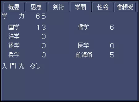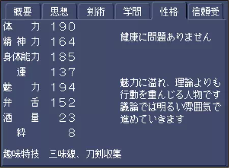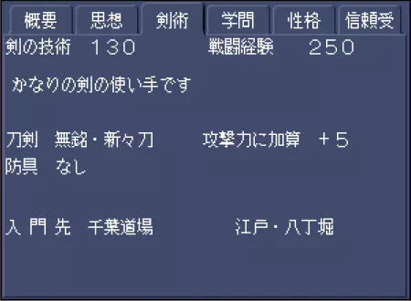 | 悪名 | 隠しパラメータです。 道場破りや人斬りをすることで数値が上昇します。 毎月わずかに減少する他、寺や神社への参拝でも減少します。 数値が高いと面会を断られることがあります。 |